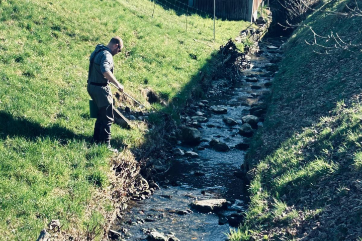 Aufgrund der vergleichsweise angenehmen Temperaturen und beständigeren Wasserständen im Jahr 2024 und der daraus folgenden, erfolgreichen Abfischungen, konnte im März 2025 eine grosse Menge an Bachforellen-Brütlinge in unsere Aufzuchtgewässer besatzt werden. Zusammen mit den freiwilligen Helfern, konnte unser Aufzucht-Verantwortlicher, Matthias Hofer, rund 7000 «Mini-Forellen» in die Müsche und weitere Aufzuchtbäche verteilen.